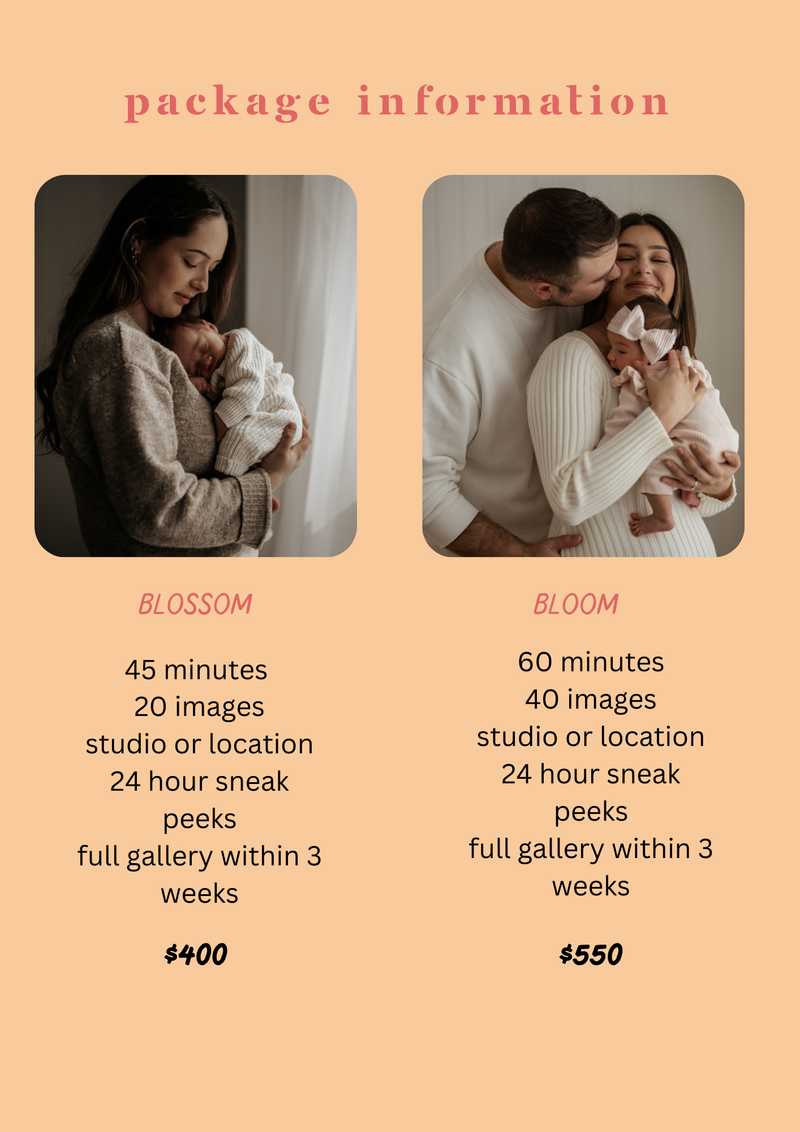 The price includes your session fee + all your photos. No surprises, nothing extra!